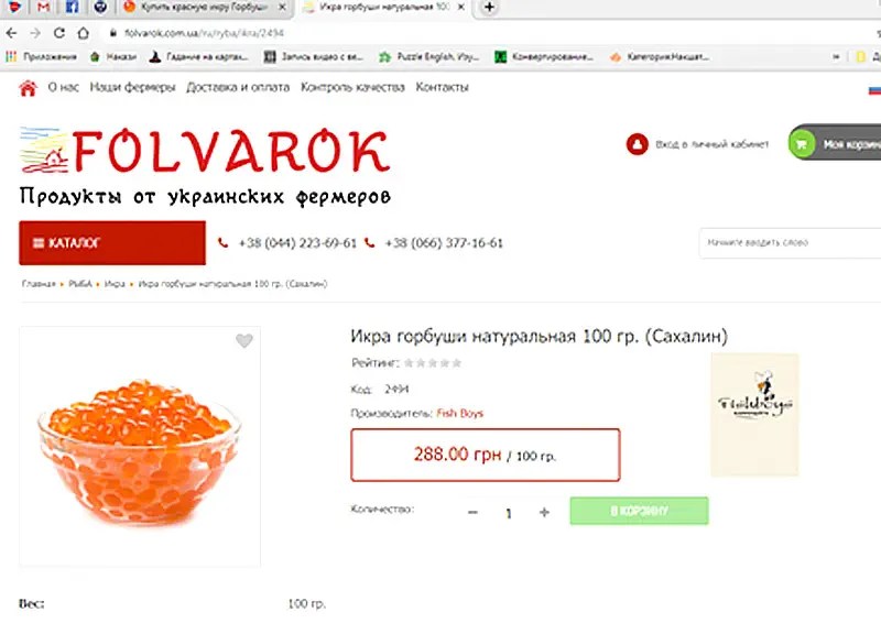 Відверто кажучи, ми не зрозуміли, навіщо купувати в інтернет-магазині ікру на вагу? Ті ж гроші, що й роздріб (228-288,00 грн/100 г), доводиться купувати одразу мінімум півкіло, та ще й ризик купівлі підробки. Але покупець має сам зробити свій вибір.