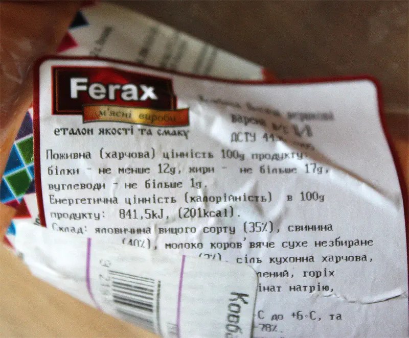 К маркировке изделий замечаний было не много. Совпало то, что замечания были именно к тем образцам, к которым были претензии и по составу. Так “Феракс” неправильно указала состав. Ингредиенты должны быть перечислены в сторону уменьшения процентного состава, почему производитель решил говядину поставить на первое место, непонятно. “Ходоровский” вообще не указал процент мяса в составе колбасы. Оба производителя “забыли” указать воду, хотя по технологии она там присутствует.