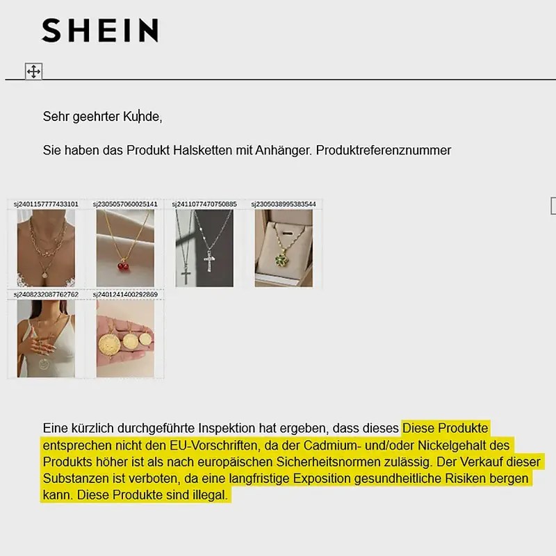 У трьох ланцюжках від Shein ми виявили небезпечну кількість кадмію – шкідлива речовина завжди містилася в підвісці, дуже високий вміст був, наприклад, у підвісці у формі вишні. Кадмій класифікується як канцероген і може спричиняти ураження кісток та нирок. Допустима межа його вмісту в ювелірних виробах в ЄС становить 0,01 % від ваги виробу. У двох ланцюжках від Shein ми виявили понад 85 % – тобто в 8500 разів більше за допустиму межу. Третій ланцюжок не перевищував гранично допустиму норму настільки сильно, але все одно містив значну кількість кадмію: у ньому було вдесятеро більше кадмію, ніж дозволено в ЄС.