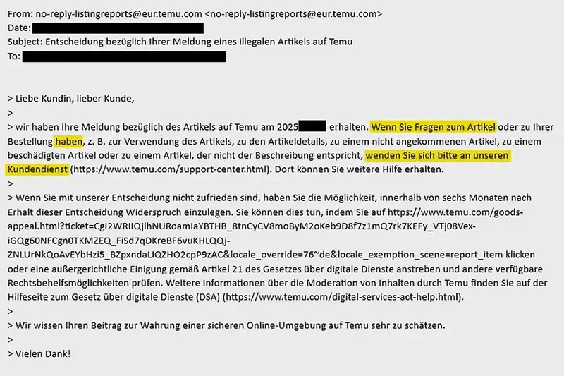 Сильні слова. Після того, як ми попередили Шейна про товари із серйозними дефектами, компанія попередила покупців електронною поштою, називаючи їх «нелегальною продукцією». Тут ми наводимо уривок з одного з листів. © Stiftung Warentest