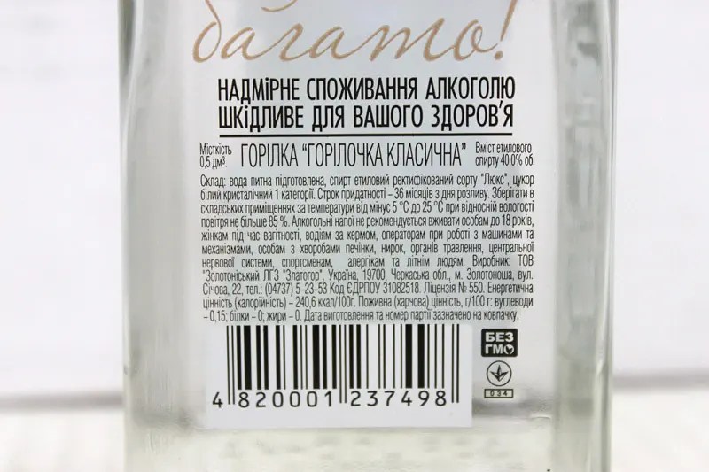 Виробник / країна виробництва (згідно маркування): ТОВ “Національна горілчана компанія”, с. Степанки, Черкаська обл. / Україна