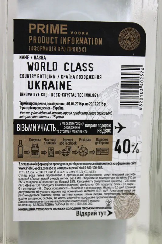 Виробник / країна виробництва (згідно маркування): ТОВ “Лікеро-горілчаний завод “Прайм”, смт. Малиновка, Харківська обл. / Україна