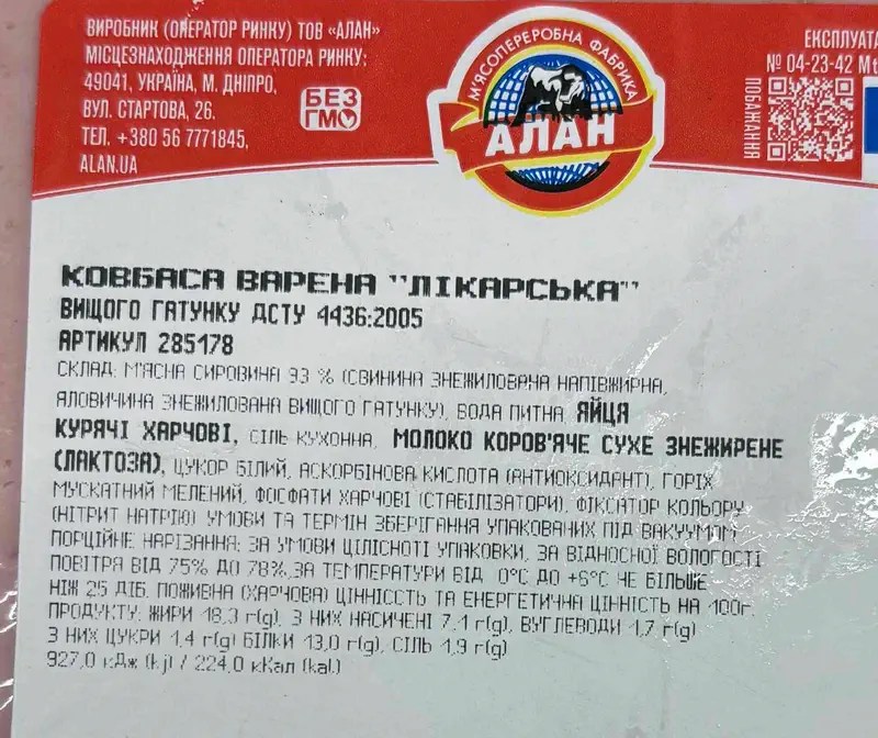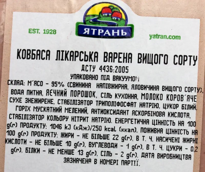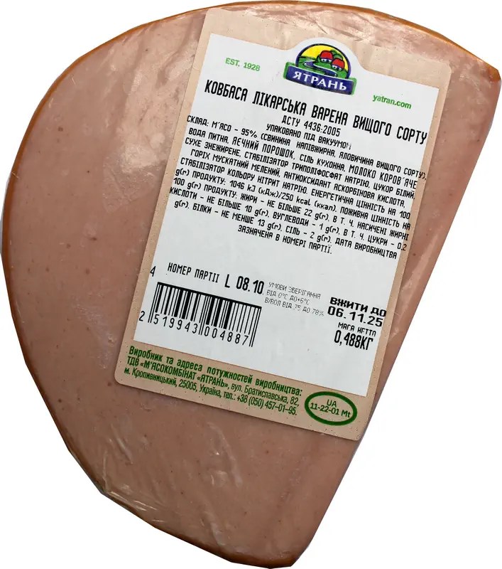 Виробник / країна виробництва (згідно маркування): ТДВ “М’ясокомбінат “Ятрань”, м. Кропивницький / Україна