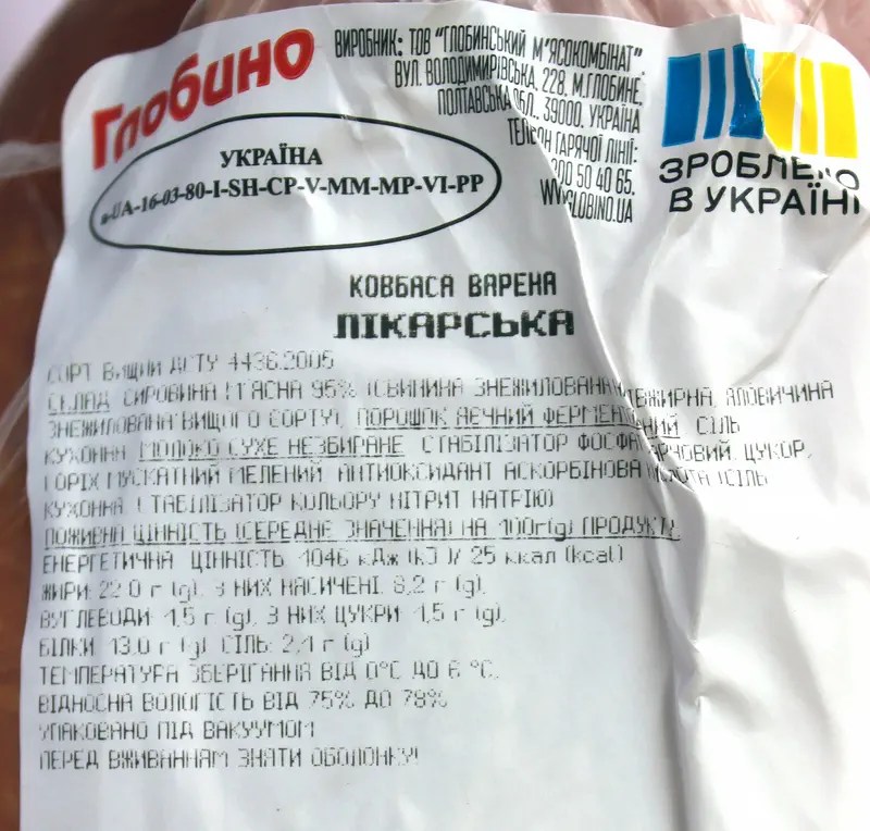 Виробник / країна виробництва (згідно маркування): ТОВ “Глобинський м’ясокомбінат”, Полтавська обл. / Україна