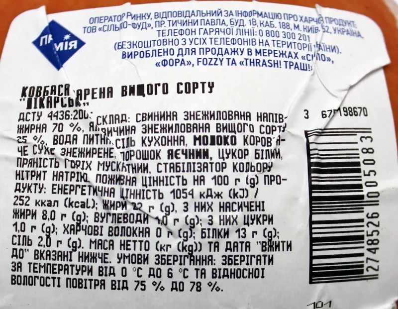 Виробник / країна виробництва (згідно маркування): ПрАТ “Кременчукм’ясо”, Полтавська обл. / Україна