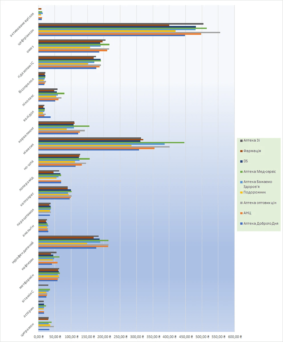 - *) сайт мережі: https://online-apteka.com.ua/ua/?srsltid=AfmBOorAQtEVr-dgPNecLR4XUFrPfWwbhtYjX0K9hjLNGU8uflcISIo5, ми не враховуємо додаткові знижки за картками, лояльністю, доставками, рецептурністю та інше