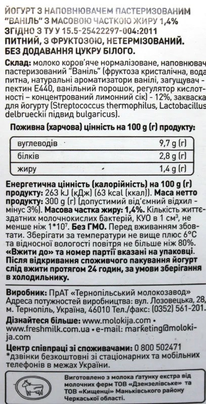 Виробник / країна виробництва (згідно маркування): ПАТ “Тернопільський молокозавод”, м. Тернопіль / Україна