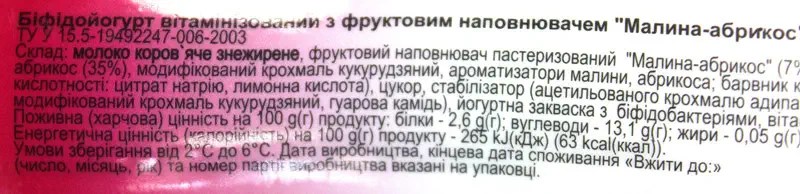 біфідойогурт вітамінізований з фруктовим наповнювачем “Малина-абрикос” нежирний